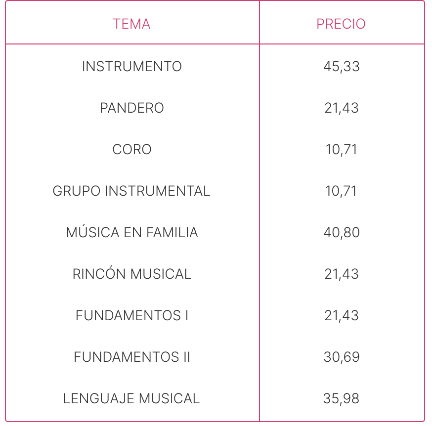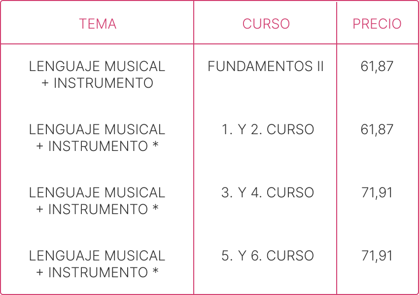Los servicios que ofrecemos en la escuela de música Juan Antxieta se pagan a través de una cuota mensual. Los importes de estas cuotas se recogen en la siguiente tabla: